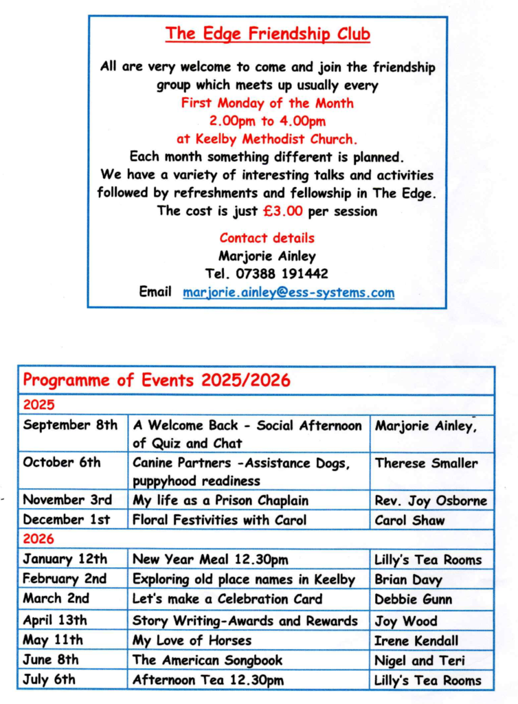 The Edge Friendship Club Programme of Events is below.